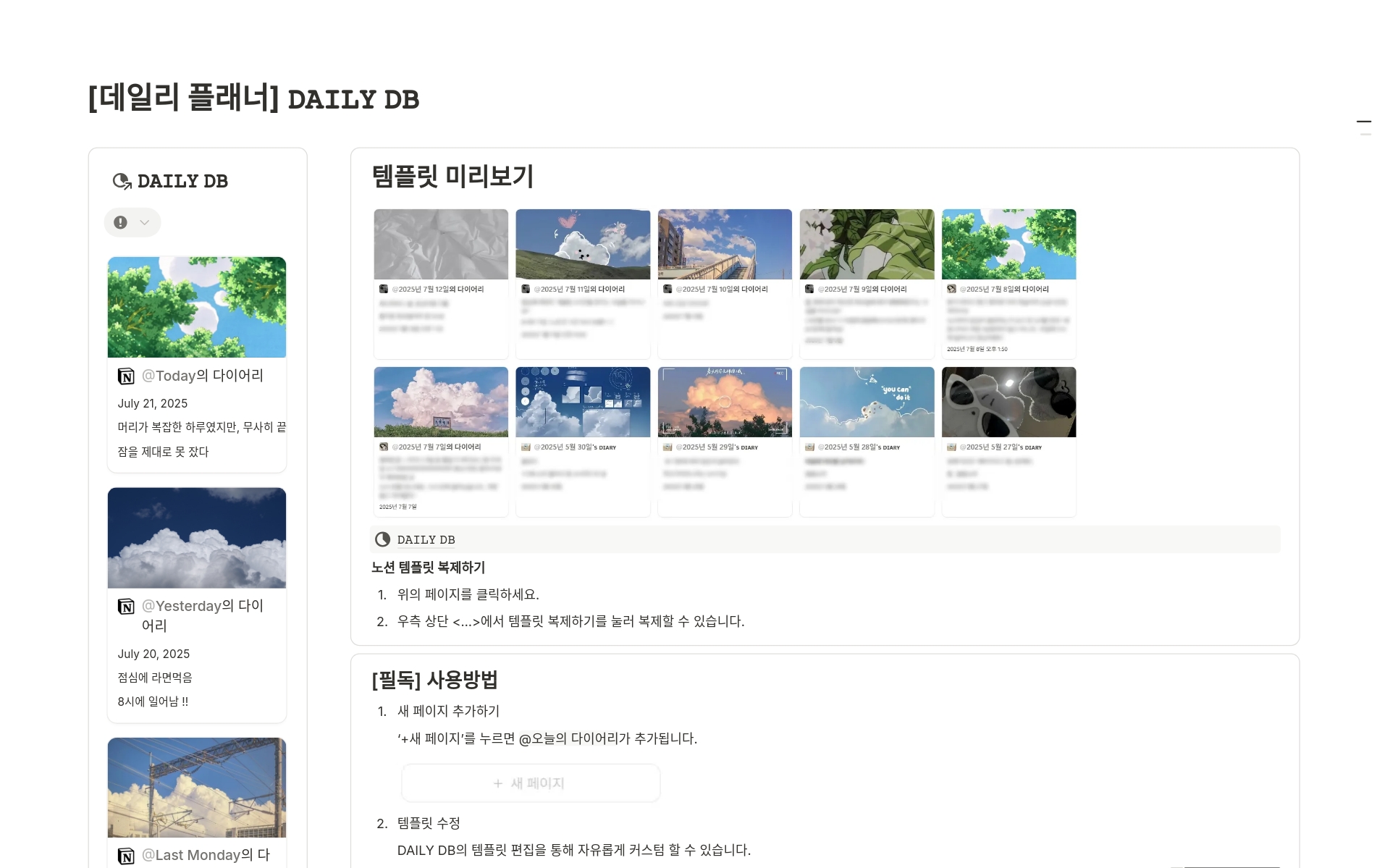 DAILY DB 블록을 추가하여 매일 기록하고 작성된 기록을 한번에 확인 할 수 있습니다. 감성에 맞는 사진과 아이콘을 추가하여 나만의 데일리 플래너를 만들 수 있습니다. 매일 하루를 기록해보세요 😺